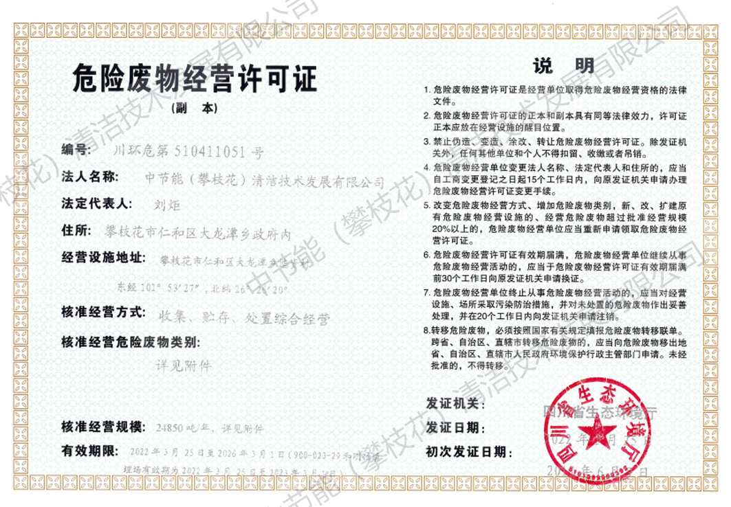 中節能(攀枝花)清潔技術發展有限公司(以下簡稱公司)成立于2008年5月,注冊資金1.6519億元。公司由中節能清潔技術發展有限公司和攀枝花市產業投資經營有限責任公司共同持股,并由中節能清潔技術發展有限公司控股經營。公司投資建設和運營的攀枝花市危險廢物處置中心項目是全國統籌部署的全國31個危險廢物綜合處置中心項目之一,位于攀枝花市仁和區大龍潭鄉迤資村華賣社,核準處理原生廢物2.425萬噸/年,可對43大類,447項(醫療廢物)進行安全處置。